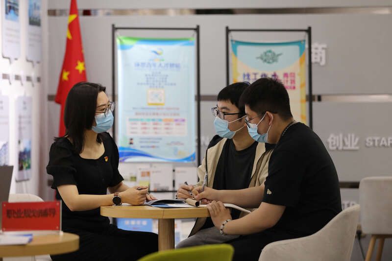 威海市环翠区“青年驿站”工作人员为大学生提供就业咨询服务。团山东省委供图