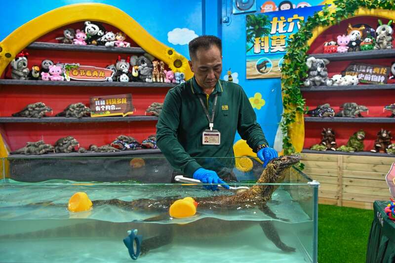 保育员苏永龙为科莫多龙洗澡。长隆供图