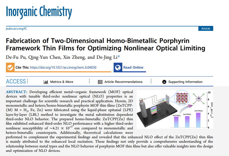 近日,材化学院2021级制药工程专业蒲德福同学以第一作者在 《Inorganic Chemistry》(SCI收录,无机化学一区,TOP期刊) 发表题为 《Fabrication of Two-Dimensional Homo-Bimetallic Porphyrin Framework Thin Films for Optimizing Nonlinear Optical Limiting》 学术论文,报道了其在非线性领域的研究成果,论文通讯作者为材化学院李德晶副教授,该工作得到了 国家自然科学基金项目(22205090)、福建省自然科学基金项目(2022J05232)和闽江学院引进人才科技预研项目(MJY22002) 的支持。