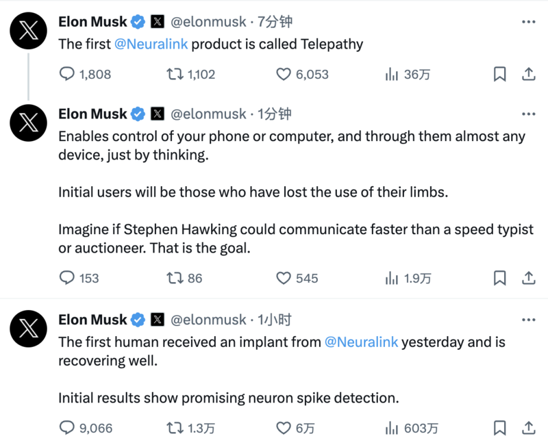 特斯拉CEO埃隆·马斯克旗下的脑机接口公司Neuralink首次将芯片植入到了人类大脑之中。1月30日,马斯克在旗下社交平台X(前推特)上宣布,昨天首位人类接受了Neuralink的植入,目前恢复良好。初步结果显示,神经元尖峰检测很有希望。