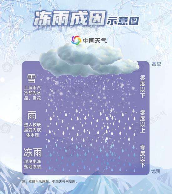 冻雨是冷暖空气交汇的产物,一般此时二者之间冷空气势力强于暖湿气流,近地面温度骤降至冰点之下,暖空气被抬升,成云致雨。虽然名字叫冻雨,但它的形成过程并不是简单地把雨滴冻上,而是水汽随着海拔变化发生形态变化的过程。