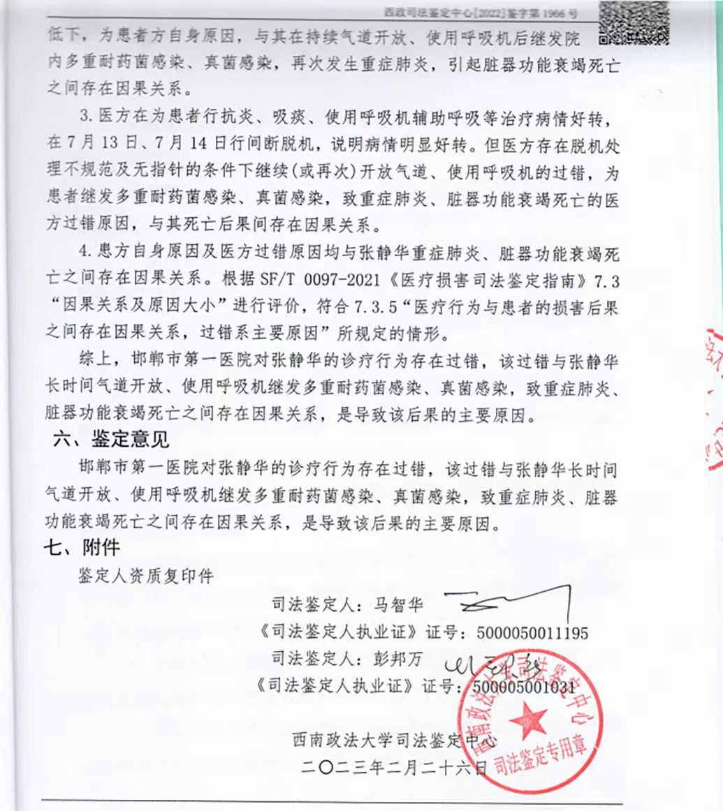 西南政法大学司法鉴定中心的鉴定意见为:邯郸市第一医院对张静华的诊疗行为存在过错,该过错与张静华使用呼吸机感染致重症肺炎、脏器功能衰竭而死亡,存在因果关系,是导致该后果的主要原因。