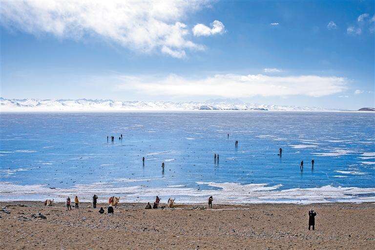 图②:日前,游客在结冰的纳木错湖面上游玩。新华社记者 孙非 摄
