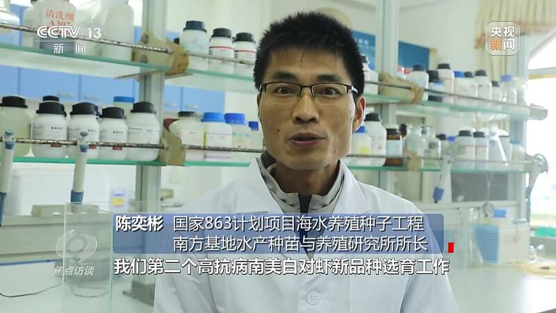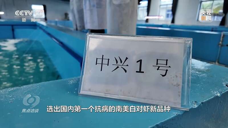 陈奕彬:“基地联合中山大学,从多个区域引进多个种群,组成一个选育的基础群体,又开始经过一代群体选育,加上五代的家系选育,历经大概八代、十年的时间,终于在2011年的时候选出国内第一个抗病的南美白对虾新品种:中兴1号。”