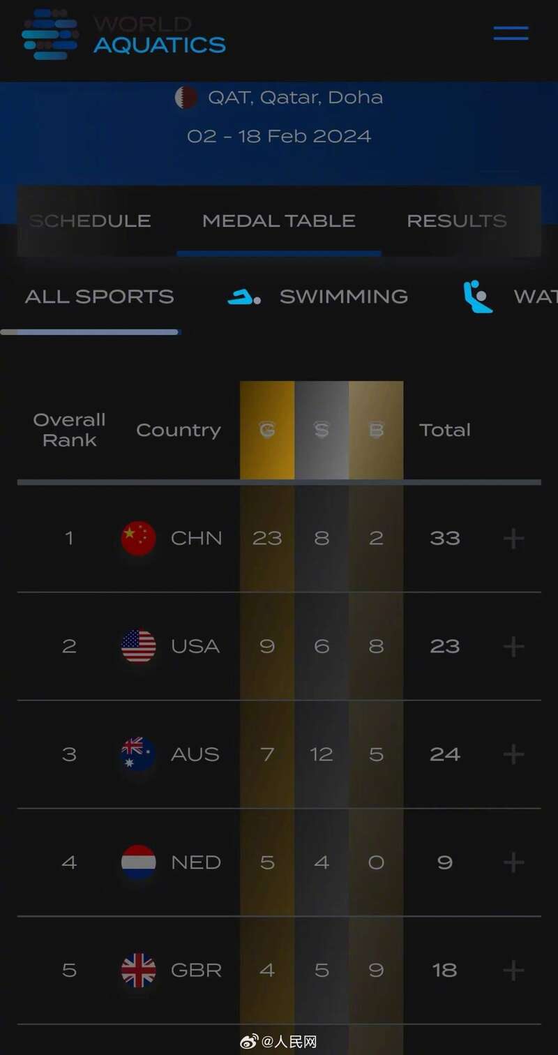 北京时间今天凌晨,2024年多哈游泳世锦赛落幕,中国队获得23金8银2铜共33枚奖牌,排名金牌榜和奖牌榜第一。其中跳水9金4银、花游7金1银1铜、游泳7金3银1铜。中国队加油!