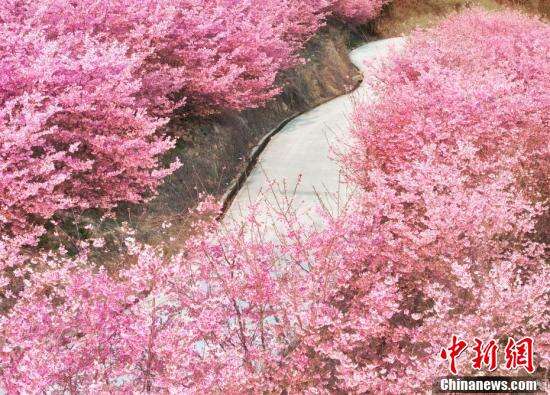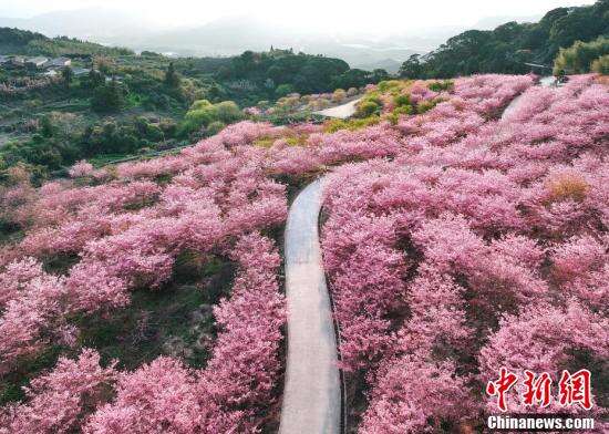 2024年2月20日,福建省龙岩市,仁隔山花千谷樱花园,樱花绽放。近日,龙岩漳平仁隔山花千谷樱花园大片大片的樱花树盛开在山坡上,漫山遍野美不胜收,密集而鲜艳,走入花海,如同走进春日油画里。