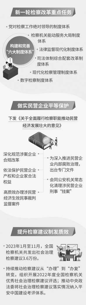 “未来五年,是推进检察工作现代化开局起步的关键五年。新一轮检察改革的主要思路是落实党中央改革部署和最高检党组提出的‘以检察工作现代化融入政法工作现代化、服务中国式现代化,推进法律监督理念、体系、机制、能力现代化’部署要求,着力在改革中解决问题,在解决问题中深化改革。”高景峰介绍说,新一轮检察改革的重点任务是按照党的二十大报告“加强检察机关法律监督工作”的部署要求,构建和完善“六大制度体系”,即党对检察工作绝对领导的制度体系、检察机关能动服务大局制度体系、法律监督现代化制度体系、司法体制综合配套改革制度体系、现代化检察管理制度体系、数字检察制度体系。