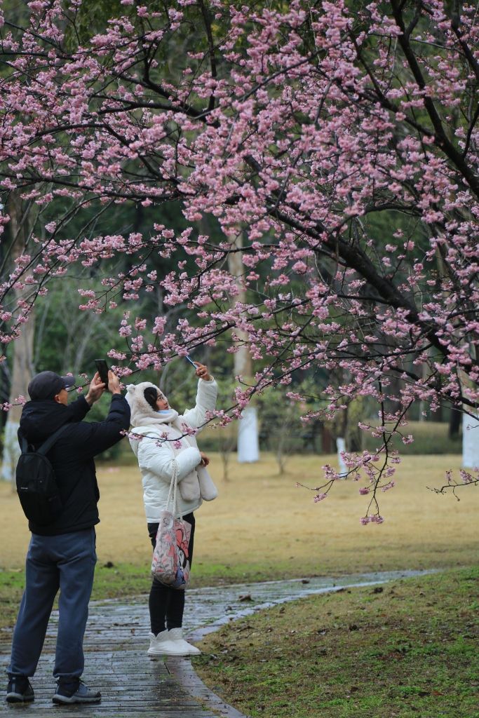 2024年2月23日,杭州植物园早樱绽放,游客在拍摄樱花。