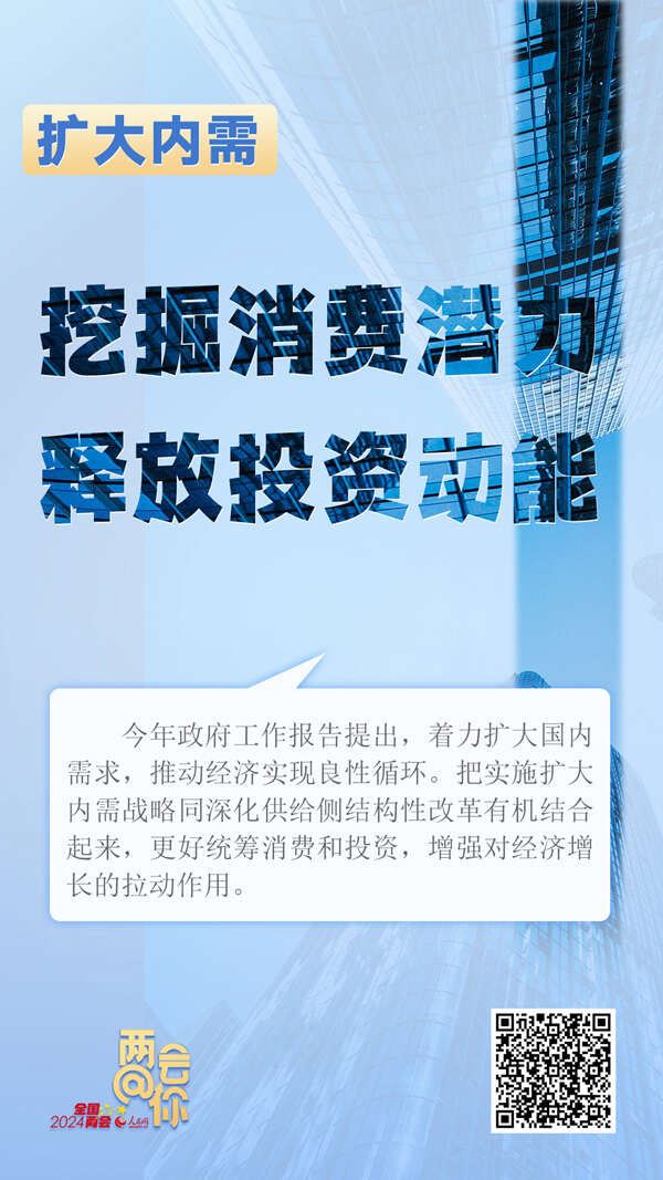 当前和未来一段时间,要巩固和增强经济回升向好态势,必须坚定实施扩大内需战略。同时要看到,我国扩大内需仍面临“有效需求不足”“部分行业产能过剩”等制约。对此,政府工作报告中对今年的促消费稳增长、积极扩大有效投资等做出了部署安排。