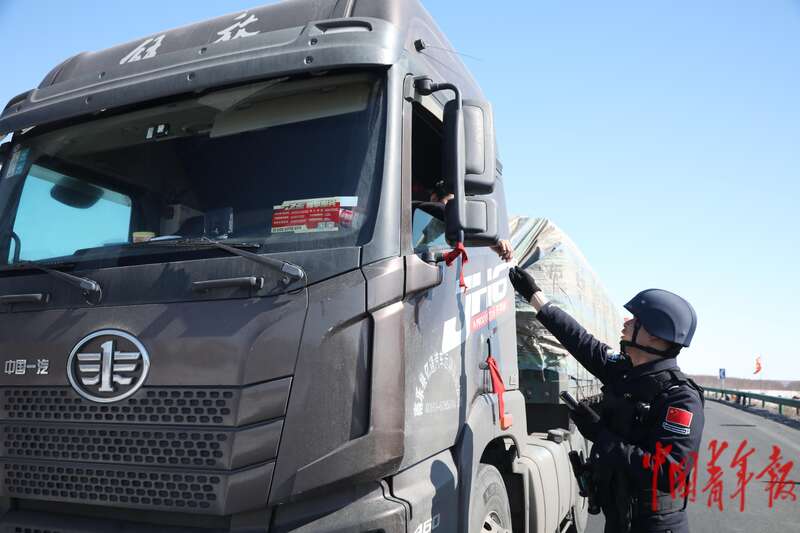 “刮白毛风,车都堵在国道上了!”宝格达山边境派出所接到报警电话,民警李春涛、杜景江立刻拿上军大衣、帽子、铁锹等装备,赶赴现场。抵达时,车辆已经排起了长龙,积雪最深处近半米高。他们一下车,顾不上风刮得脸生疼,用铁锹挖除车辆周边积雪,尽力救援被困人员。不一会儿,他们的面罩、眉毛上凝结起一层厚厚的冰霜。