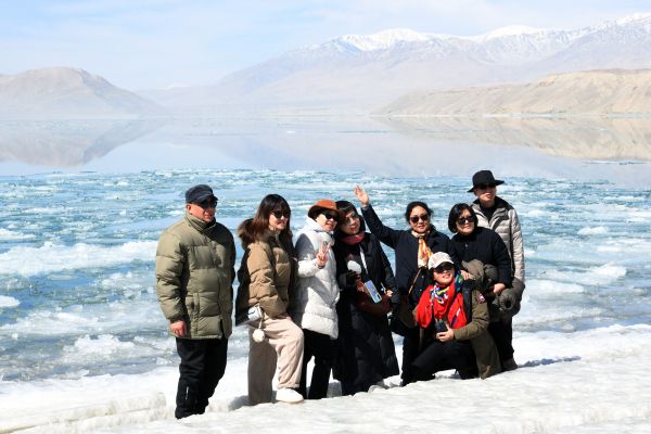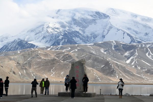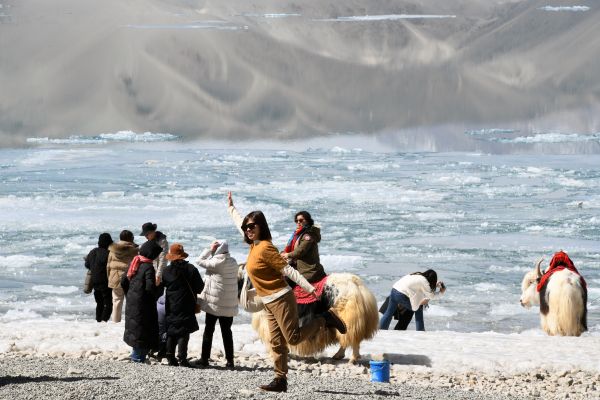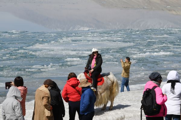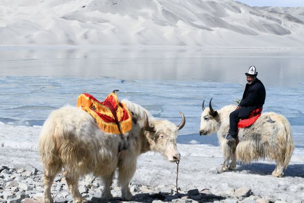 2024年3月18日,新疆克州,一名旅游从业人员在白沙湖畔带着牦牛等待游客。进入3月以来,随着气温逐渐转暖,春回帕米尔高原,湖中积冰逐渐消融,雪山依旧巍峨,壮美的景色吸引八方游客前来观赏。 中新社记者 孙亭文 摄