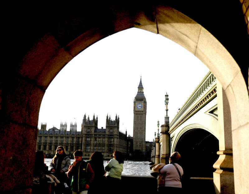 人们在英国伦敦横跨泰晤士河的威斯敏斯特桥上行走。