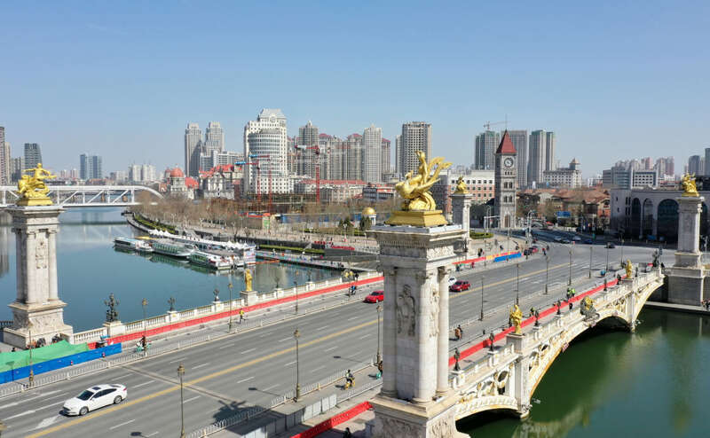 这是在天津拍摄的海河上的多座桥梁(无人机照片)。
