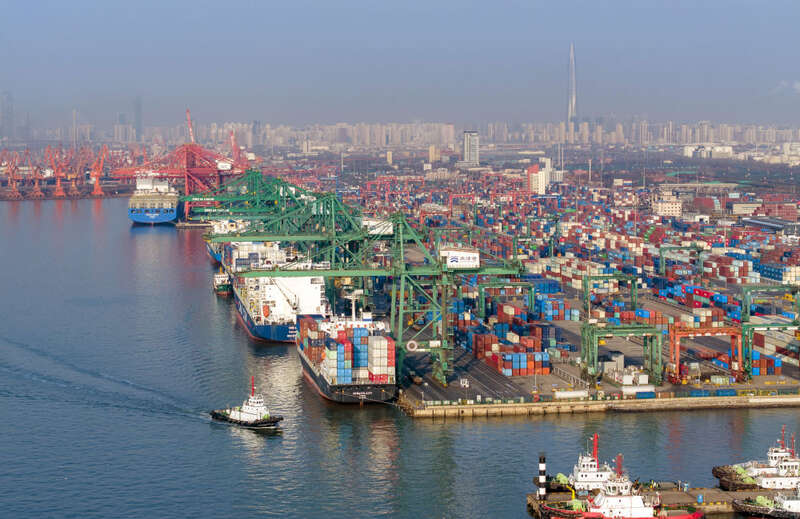 货轮停靠在天津港集装箱码头(无人机照片)。