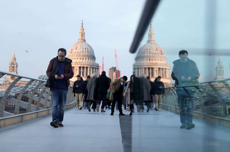人们在英国伦敦横跨泰晤士河的千禧桥上行走。