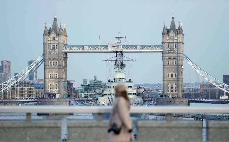 一名女子在英国伦敦横跨泰晤士河的伦敦桥上行走,不远处是地标建筑——塔桥。