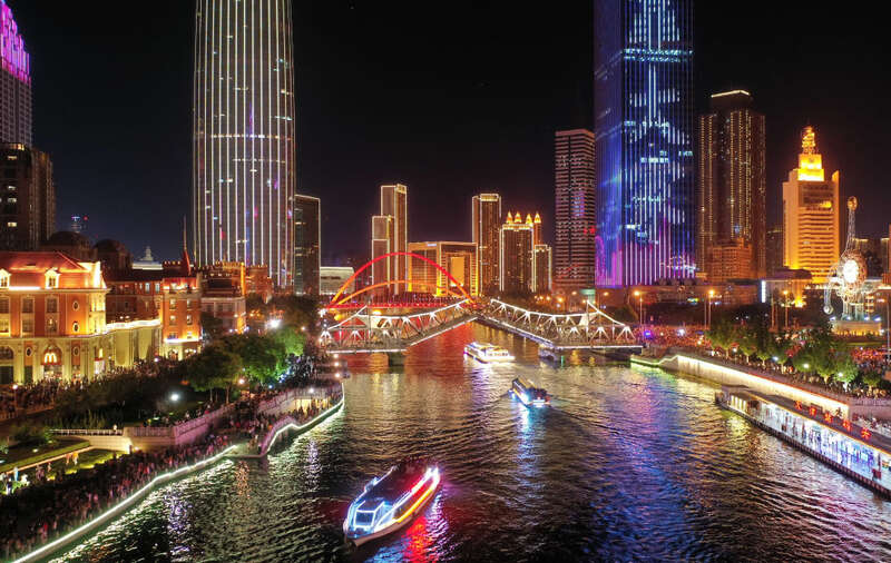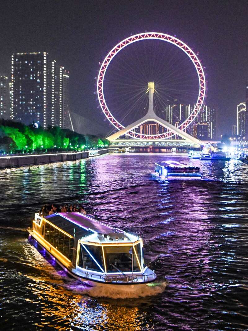 夜幕降临,约上三两好友,行船海河之上,水面泛起涟漪,晚风拂过脸颊,人们的笑声、目光里的霓虹,为这座城市增添了更多韵味。