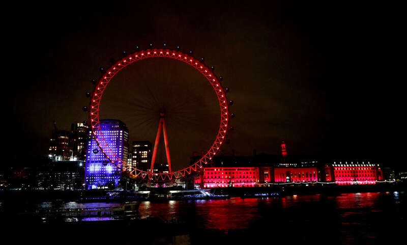 英国伦敦的泰晤士河边,“伦敦眼”摩天轮为庆祝中国农历新年而亮起红色灯光。