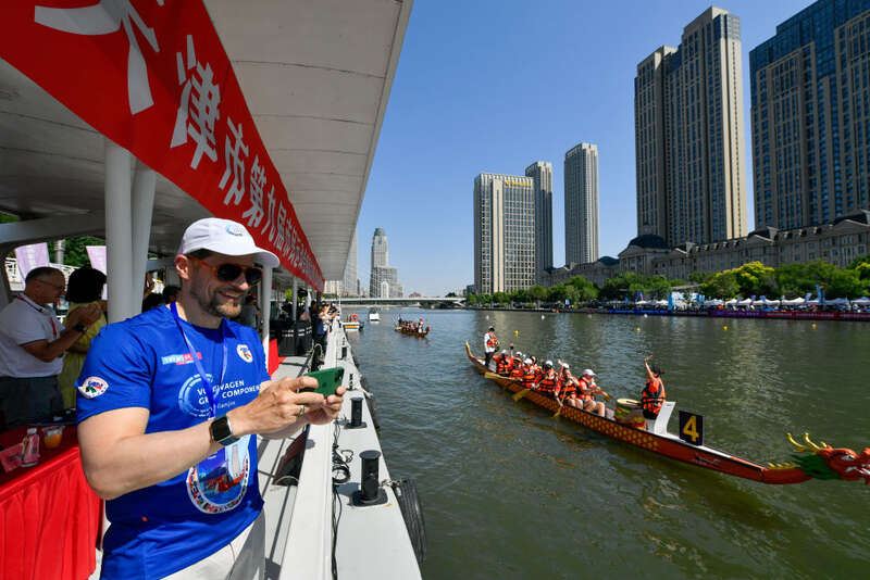 在天津海河利顺德码头,外国友人观看龙舟比赛。