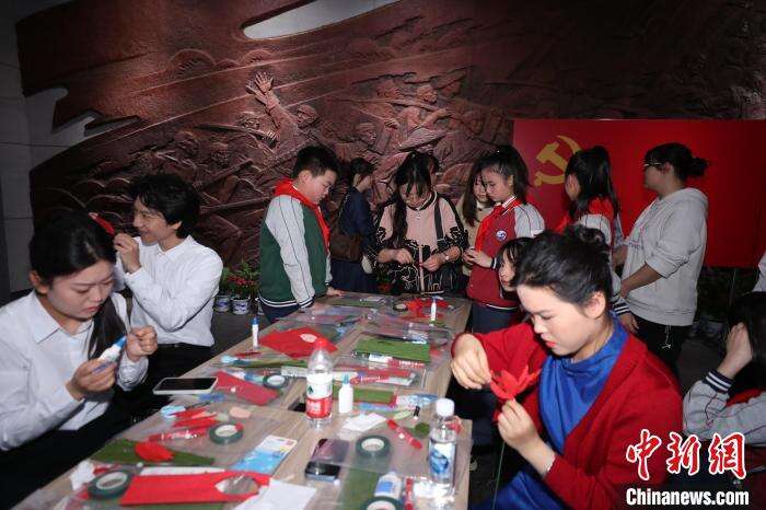 图为参加活动的学生正在手工折制映山红花。江西省革命烈士纪念堂供图