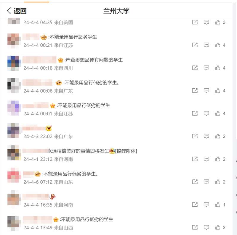 另外,在兰州大学官微留言中,从3日开始已经几乎被众多网友“洗版”“刷屏”。多数网友希望兰州大学方面采取慎重态度,有网友留言“不能录用品行恶劣学生”“德智体,德在第一”。