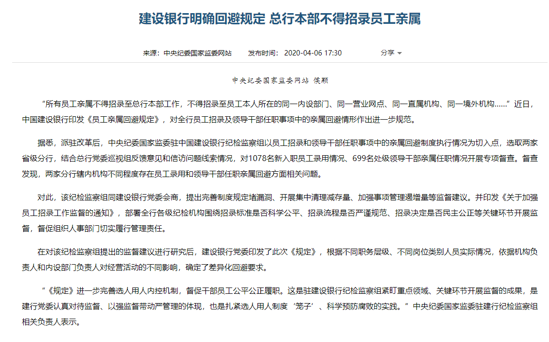 另据中央纪委国家监委网站消息,中国建设银行也于2020年印发《员工亲属回避规定》,对全行员工招录及领导干部任职事项中的亲属回避情形作出进一步规范。所有员工亲属不得招录至总行本部工作,不得招录至员工本人所在的同一内设部门、同一营业网点、同一直属机构、同一境外机构。