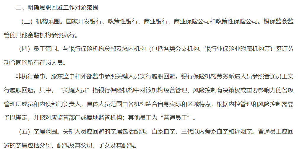 事实上,早在2019年,原中国银保监会发布的《关于银行保险机构员工履职回避工作的指导意见》就明确规定,银行保险机构的管理层成员等关键人员本人与其配偶、直系血亲、三代以内旁系血亲和近姻亲等亲属不得在同一单位担任双方直接隶属于同一管理层成员的职务或有直接上下级管理关系的职务。