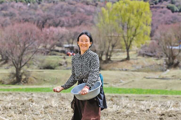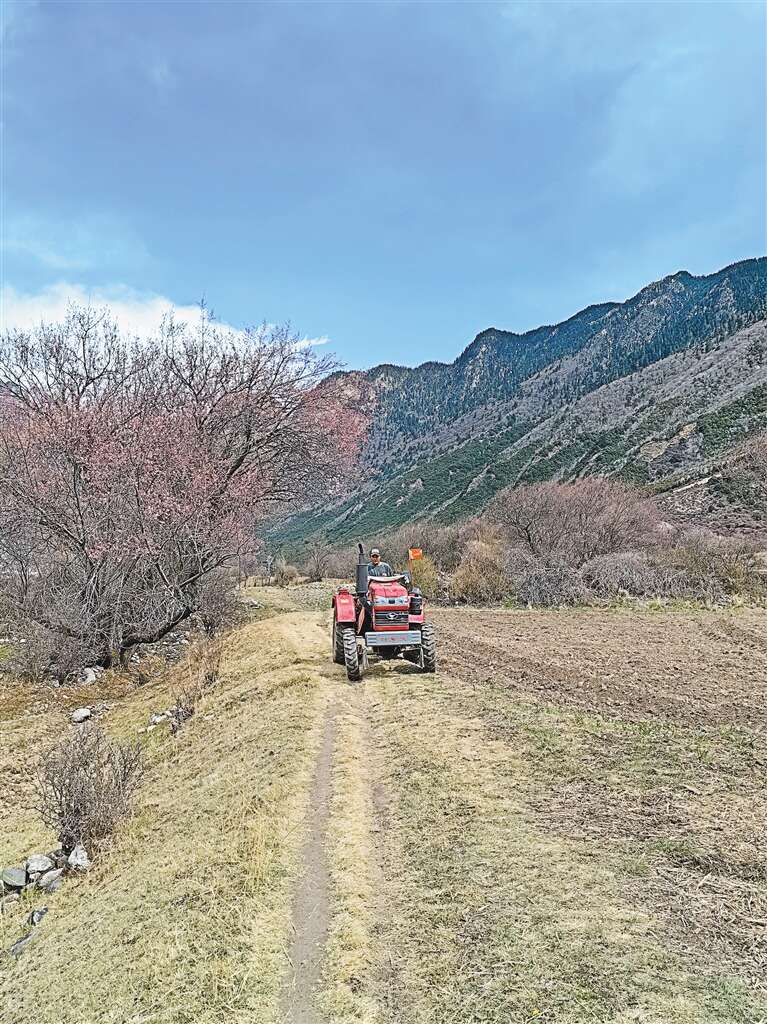 一辆红色的旋耕机在田地旁停下来,曲美仁增边换犁头,边感叹着科技带来的便捷:“以前耕地全靠牲畜,费时耗力,现在开着旋耕机就把地耕完了,听着这机器轰隆隆的声音,我觉得格外开心,好像在说我们尼屋的春天特别美,我们的生活肯定也会更幸福!”