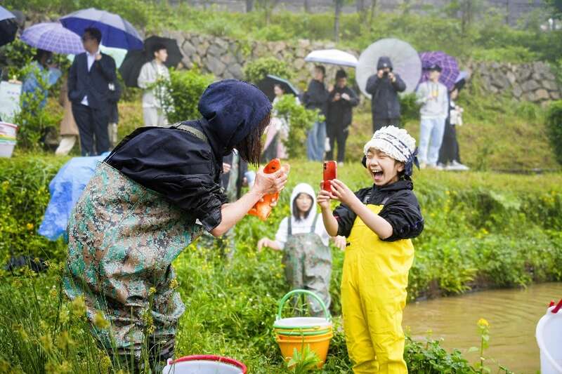 在云和梯田,游客可以带着孩子免费体验田间摸鱼、抓鸭、挑水等趣味活动。同时,游客还能在梯田认养盲盒、体验漆扇,相遇“卖货郎与花韵仙子”。小丑叔叔的互动表演,给孩子们增添了童年乐趣。