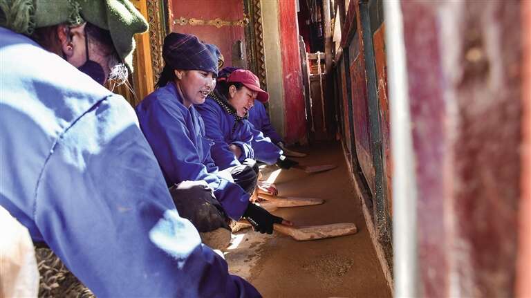 25载时光飞逝,从技艺生疏的新人,到泥匠组的负责人,贡觉旺姆与同事们保护、修复着布达拉宫的每一处屋顶、地坪与墙面。“我们的工作每天要与土打交道,每次看着布宫的一处处裂缝被修缮好,心底总有种自豪感。”贡觉旺姆说,“阿嘎”制成的屋顶具有特殊的韧性,即使下方支撑的木梁发生了断裂,整个屋顶也不容易坍塌,是布宫最坚固的一层铠甲。
