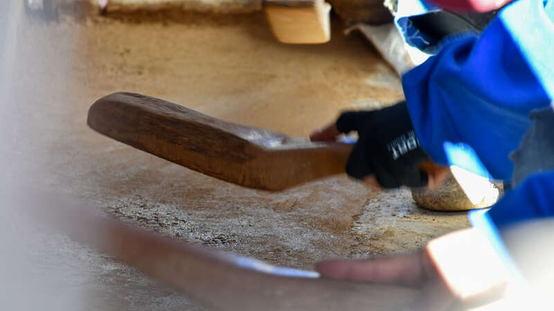 5名藏族女工一边唱着歌,一边用手中的工具“帛多”夯打着脚下的碎石和泥土,木棒夯土的声音是节奏,歌声与步调统一,她们一轮又一轮地合唱着。在不间断地敲打地面数小时后,石子状的“阿嘎”被打成平地。达桑告诉记者,这是泥匠组在通过“打阿嘎”对布宫地面有裂缝的地方进行修补。