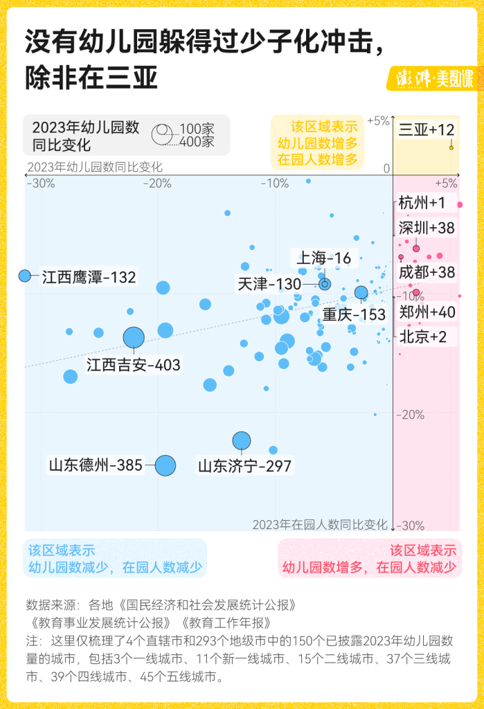 澎湃新闻通过梳理各地《教育事业发展统计公报》等文件,从全国 4 个直辖市和 293 个地级市中,汇总出了目前已披露 2023 年学前教育情况的 150 个城市。发现有 80% 的城市在 2023 年出现了幼儿园数量减少的情况,而其余幼儿园数量不减反增的,主要是一线、新一线或省会城市。