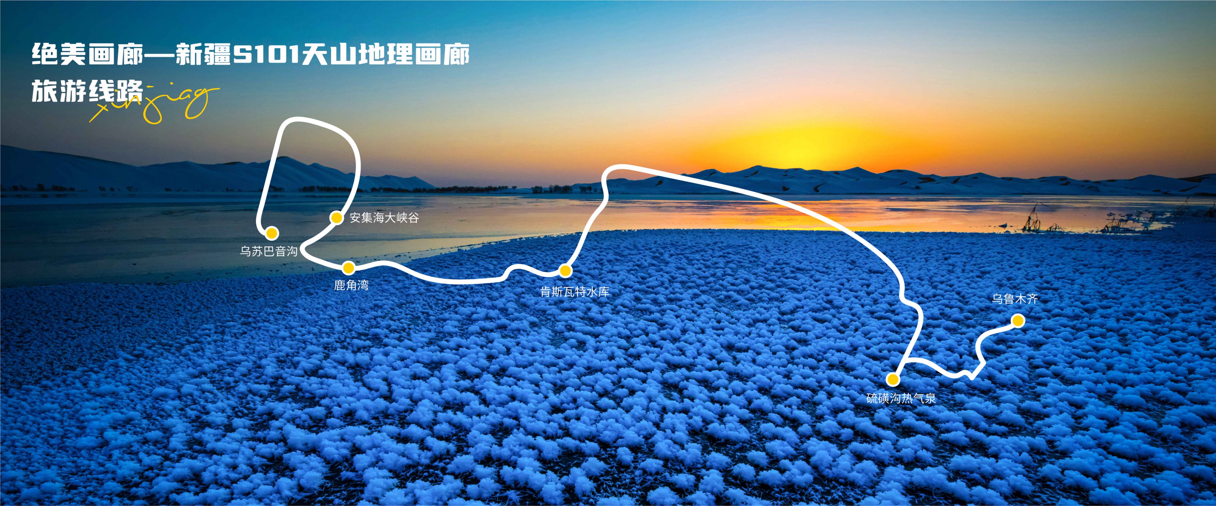 新疆S101天山地理画廊旅游线路,东起乌鲁木齐,西至乌苏巴音沟,沿线覆盖亚洲地理中心、硫磺沟热气泉、肯斯瓦特水库、鹿角湾、安集海大峡谷等众多景区(点),有雅丹、丹霞地貌,有河谷、草原、雪山、峡谷、湿地、温泉等旅游资源,自然景观错落有致,沿途风光色彩斑斓,是徒步者的圣地,是自驾游的天堂,被网友称为新疆的“调色板之路”。