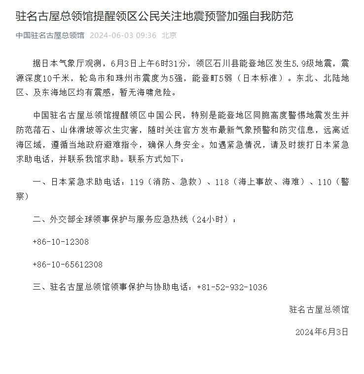 6月3日,中国驻日本名古屋总领馆提醒领区中国公民关注地震预警加强自我防范。全文如下: