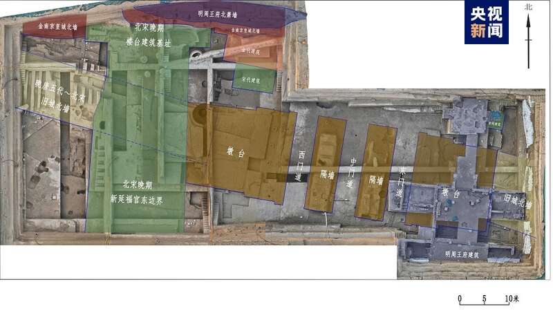 其中,景龙门遗址位于河南省开封市龙亭区,原是北宋东京城内城北墙中部城门。2023年至2024年的发掘显示,城门整体结构为一门三道式,由门道、隔墙及两侧墩台构成,通阔约60米、进深约19.3米。