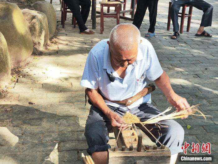 树荫下,有位老人在表演“杂技”。搓、缠、拨、结,一气呵成,粗粝的大手捋着稻草上下翻飞,不多时,一双崭新的草鞋便初具雏形。