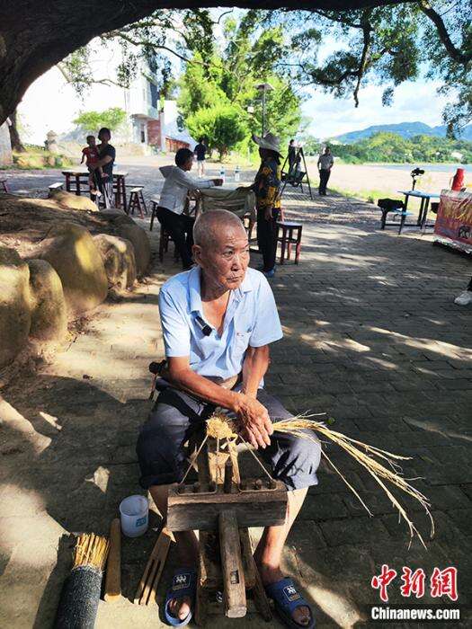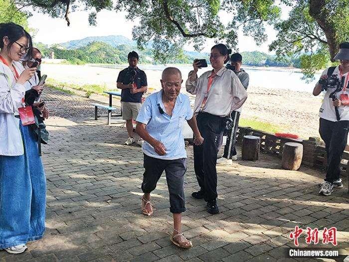肖爷爷干脆示范起来——草绳从脚趾中间穿过,系在踝关节处,就牢固了。他套上草鞋,健步如飞,绕着大榕树走了半圈,可谓老当益壮,英姿飒爽。两相对比,引发现场善意哄笑。