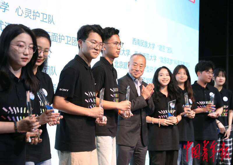 7月16日,北京,索尼影像技术学院,优秀大学生志愿者团队的代表们上台领奖。据介绍,此次有30所高校团队获奖,他们结合自身专业特长与地方风貌,为各地乡村儿童带去了主题多样的可持续发展课程与科学实验课程,展现了当代大学生勇于担当的精神风貌。中青报·中青网记者 陈剑/摄