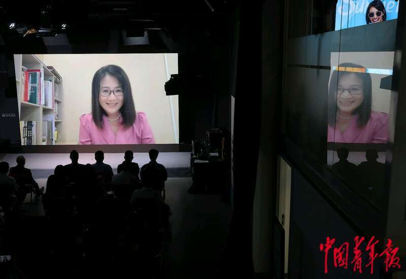 7月16日,北京,索尼影像技术学院,高校带队教师代表、来自中国传媒大学经济与管理学院的于晗老师通过视频发言,鼓励大学生志愿者们继续为构建更加公平和高质量的教育环境、促进社会进步贡献青年力量。中青报·中青网记者 陈剑/摄