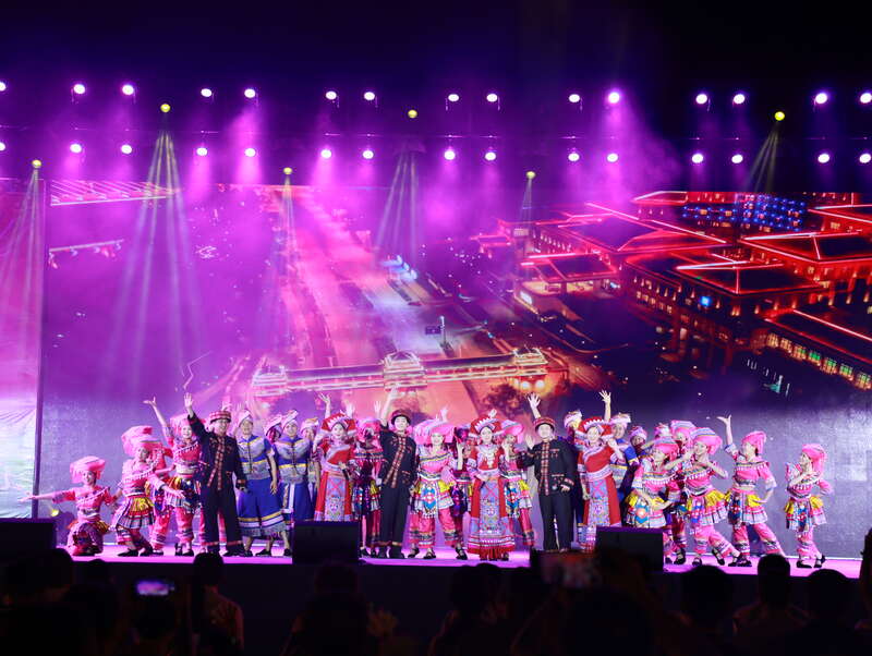 启动仪式结束后,桂滇黔三省区的青年为市民们送上了精彩纷呈的民族文艺演出。演出在广西歌舞《欢乐壮乡》中拉开了序幕,生动展现了“壮乡人民好日子千人唱万人和,天天放在歌里过”的幸福图景。随后,贵州侗族大歌《金色童年》,云南《珠源石榴红》等节目把演出推向高潮,赢得现场观众阵阵掌声。演出在火遍全网的民族舞蹈《跺跺脚》中落下帷幕。整场演出由十四个节目组成,三省区各族青年通过歌伴舞、情景舞蹈、小组唱、原生态山歌、大歌等多种表演形式,呈现出浓郁的民族风情,唱响了三省区各族人民共同富裕、守望相助、团结进步的美好愿景。