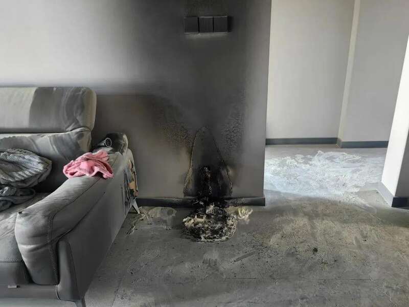 2024年2月,广东省梅州市一房屋起火,墙体、地面全被熏黑,在客厅角落的扫地机器人被烧得面目全非,家中两只猫咪也不幸死亡,起火原因为扫地机器人内部锂电池发生热失控蔓延成灾。