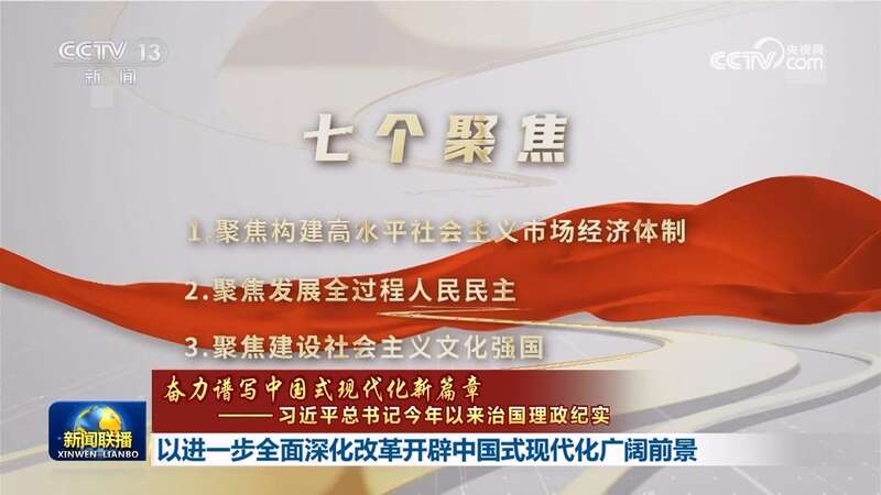 央视网消息(新闻联播):今年是新中国成立75周年,是实现“十四五”规划目标任务的关键一年。今年以来,习近平总书记锚定“全面建成社会主义现代化强国、实现第二个百年奋斗目标,以中国式现代化全面推进中华民族伟大复兴”这个中心任务,站在战略和全局高度谋篇布局,作出一系列重大决策部署,引领党和国家事业发展不断取得新成就。《新闻联播》从今天(8月2日)起推出系列报道《奋力谱写中国式现代化新篇章——习近平总书记今年以来治国理政纪实》。今天播出《以进一步全面深化改革开辟中国式现代化广阔前景》。