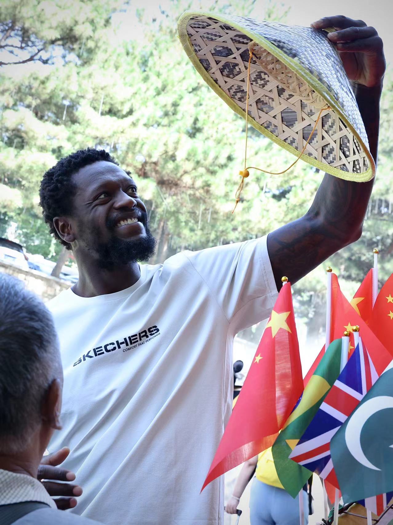 在路边售卖旅游纪念品的摊位边,兰德尔对中式草帽展现出了极大兴趣。