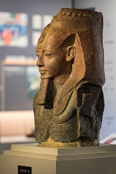 2024年8月4日,河南省安阳市,殷墟博物馆新馆三楼“世界的商文明”展厅上的拉美西斯二世雕像(仿)。拉美西斯二世,古埃及历史上最著名的法老之一,拥有一段充满传奇色彩的人生。