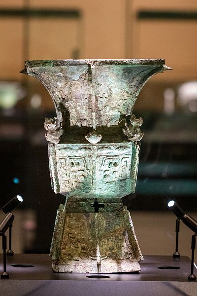 2024年8月4日,河南省安阳市,殷墟博物馆新馆展厅“长从何来——殷墟花园庄东地亚长墓专题展”上展出的“亚长”铜方尊。方尊口部近方形,束颈,平底,高圈足。肩部正中浮雕兽头,四角各立一鸟状浮雕怪兽,腹部饰蝉纹及饕餮纹,圈足亦饰饕餮纹。颈部外侧有铭文“亚长”。通高51.9厘米,重27.43千克。年代:商代(约公元前1600年—公元前1046年)。2000年安阳花园庄亚长墓出土。