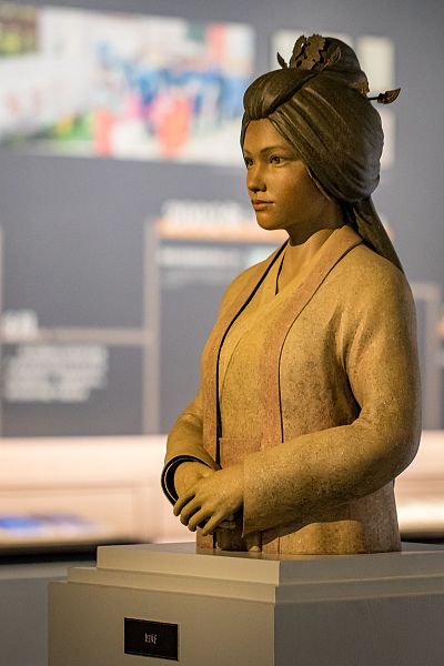 2024年8月4日,河南省安阳市,殷墟博物馆新馆三楼“世界的商文明”展厅上的妇好雕像。妇好,姓好,“妇”为亲属称谓,先秦女性姓写在最后,中国历史上有据可查的第一位女性军事统帅,同时也是一位杰出的女政治家。死后庙号“辛”,生活于公元前13世纪后半叶武丁重整商王朝时期。铜器铭文中又称“后母辛”,后为尊称,庙号称辛,即乙辛,周祭卜辞中所称的妣辛。铜器铭文中又称“后母辛”。