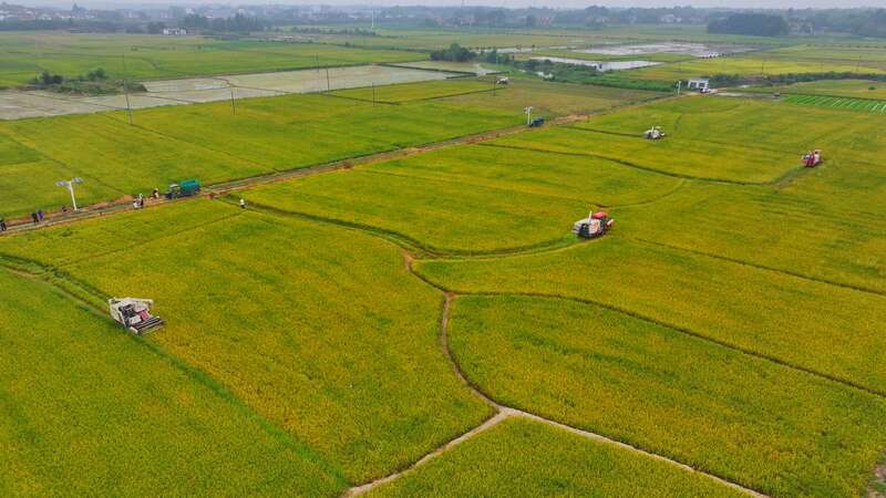 数台智能化的大型收割机同时启动,开足马力在稻田里来回穿梭,割穗、脱粒、稻谷装车等工序一气呵成,轰鸣的机器声取代了传统人工作业的辛劳场景。