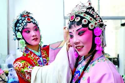 一位湖北越调青年演员帮助伙伴整理头饰。