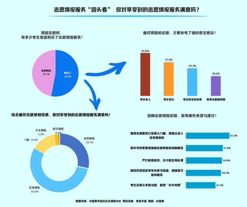 本次调查中,高考生占39.5%,考生家长占60.5%。52.9%的受访考生家庭购买了志愿填报服务。