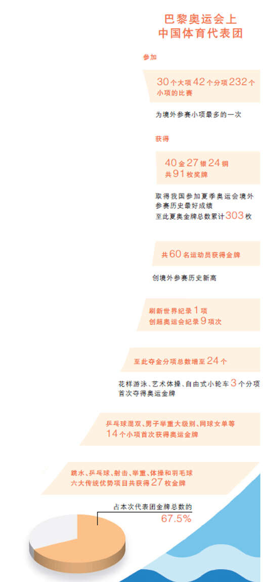 巴黎奥运会上,中国体育代表团获得40金27银24铜共91枚奖牌,取得我国参加夏季奥运会境外参赛历史最好成绩,书写了中国体育事业新的辉煌。六大传统优势项目继续保持高水平,基础大项、潜优势项目和新兴项目实现重大突破。中国体育健儿团结一心、顽强拼搏,奋勇争先、不负使命,实现了比赛成绩和精神文明双丰收。